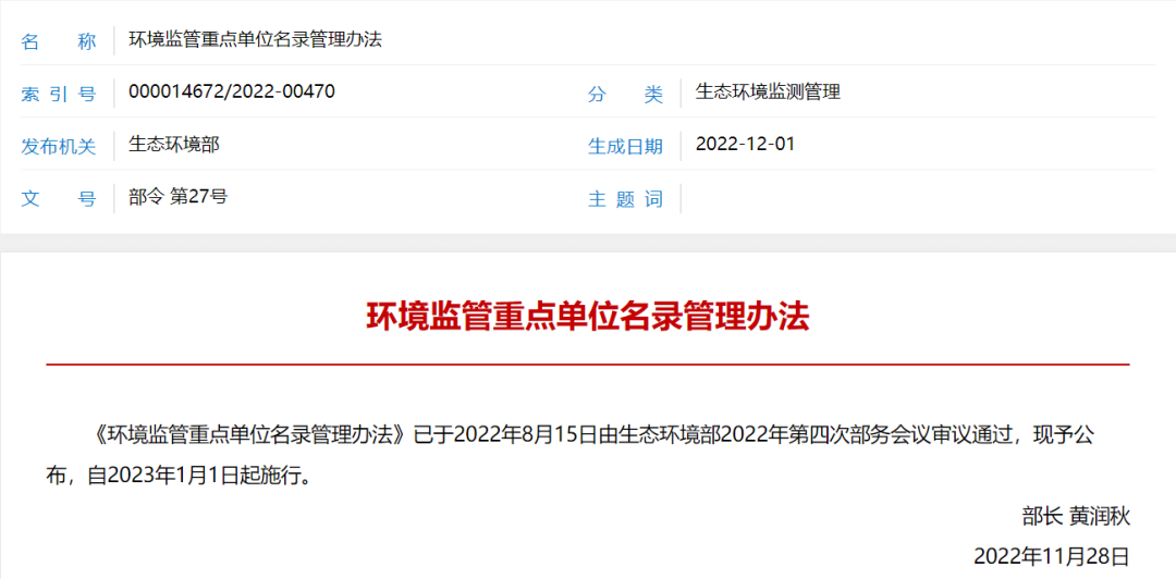 12月1日,生態(tài)環(huán)境部發(fā)布《環(huán)境監(jiān)管重點(diǎn)單位名錄管理辦法》(部令第27號),進(jìn)一步明確了重點(diǎn)排污單位名錄的確定和發(fā)布。《辦法》將于2023年1月1日起施行。有哪些單位要被列為重點(diǎn)排污單位呢?省市兩級生態(tài)環(huán)境主管部門要承擔(dān)哪些職責(zé)呢?