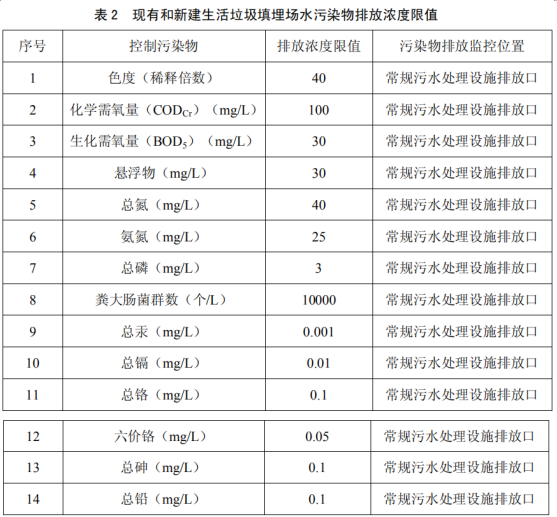 2、 現(xiàn)有和新建生活垃圾填埋場自 2008 年 7 月 1 日起執(zhí)行表 2 規(guī)定的水污染物排放濃度限 值。